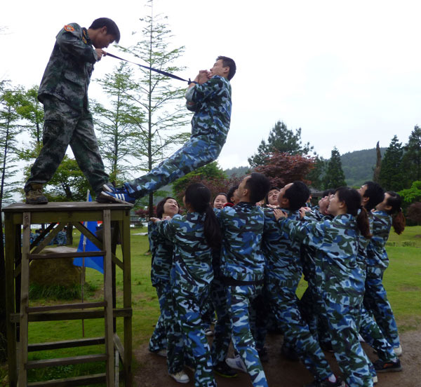 開班前,教練通過了一系列的歡快活動(dòng),把全體成員分為五隊(duì)(鷹之隊(duì)、屠龍隊(duì)、步步隊(duì)、牛哄哄隊(duì)、如意隊(duì)),參加了信任背摔、七巧板拼圖、盲人方陣、高空行走、接力傳遞球和凌空擊鼓等活動(dòng)。經(jīng)過激烈的比賽,強(qiáng)烈意識(shí)到:成功必須鍛煉意志和培養(yǎng)團(tuán)隊(duì)協(xié)作的品德情操。如高空行走時(shí)每個(gè)成員必須膽大心細(xì),敢于挑戰(zhàn),相互鼓勵(lì),戰(zhàn)勝恐懼;而凌空擊鼓講究的是同心協(xié)力,要有團(tuán)隊(duì)協(xié)作精神、要有絕對(duì)服從的思想、要有顧全大局的理念。