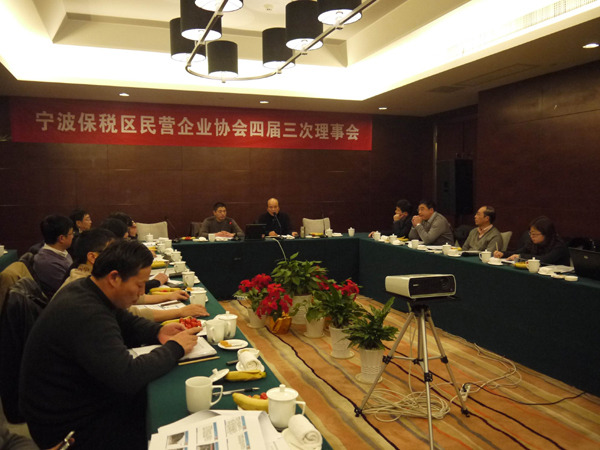 賽爾網訊 2011年12月28日,寧波市保稅區民營企業協會四屆三次理事會在寧波東方石浦大酒店召開。會議由寧波保稅區工商分局局長徐小斌主持,副局長林崇尚、賽爾集團常務董事朱玲、寧波中冠工貿有限公司總經理沈錠榮等各企業協會理事出席了此次會議。