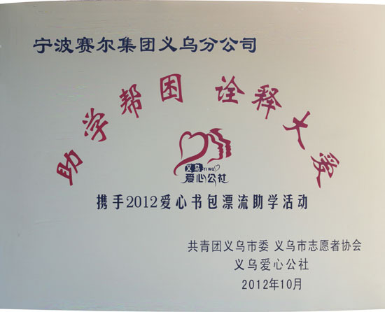 10月,寧波賽爾集團(tuán)收到了來自共青團(tuán)義烏市委、義烏市志愿者協(xié)會(huì)以及義烏市愛心公社送來的“2012愛心書包漂流助學(xué)活動(dòng)”的牌匾。
