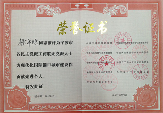 徐平炬董事長作為民建市委會委員、民建企業(yè)家協(xié)會常務(wù)副會長,與其他50人共同榮獲“寧波市各民主黨派工商聯(lián)無黨派人士為現(xiàn)代化國際港口城市建設(shè)作貢獻(xiàn)”先進(jìn)個人稱號,并接受了大會表彰。近年來,徐平炬董事長帶領(lǐng)賽爾集團不懈努力,為寧波港口城市建設(shè)做出了重要貢獻(xiàn):