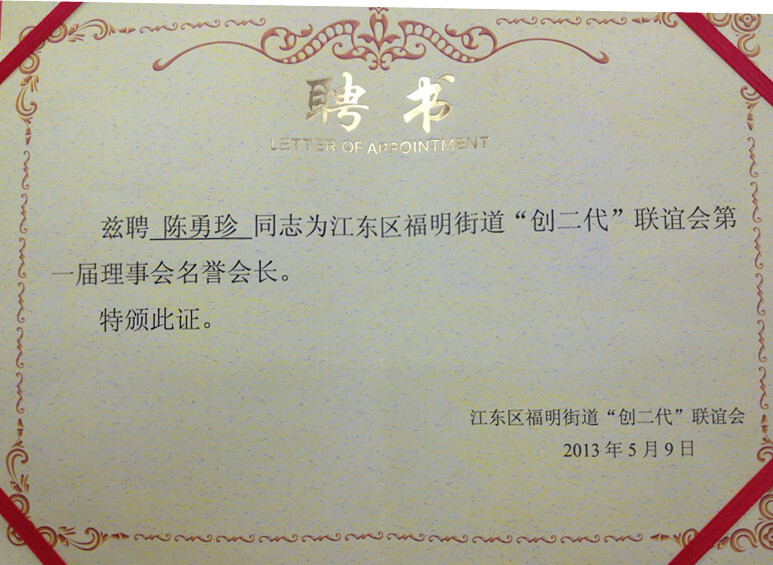 賽爾網訊 為充分集聚人才優勢,有效搭建服務企業健康發展和促進青企業家成長成才、提升創業創新意識和能力的平臺,江東區福明街道于59日下午,成立了“創二代”聯誼會。區委統戰部部長楊勇,街道黨工委副書記、辦事處主任朱波,街道辦事處副主任何燕波,街道黨工委委員、紀工委副書記邱偉應邀出席成立大會。會議決定聘請優景進出口董事長陳勇珍為聯誼會名譽會長。