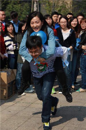 “心心相印”追求的是倆倆組隊的5個比賽小組用5個不同的姿勢來運送氣球。這個比賽項目讓賽爾人的創新精神發揮的淋漓盡致。有胸對胸的,腰靠腰的,頭并頭的,還有嘴刁氣球的“套馬桿”姿勢。氣球也不全是乖乖的,有些半路飛走的,還得讓隊員費勁地追回來再繼續奔跑,簡直太歡樂了!