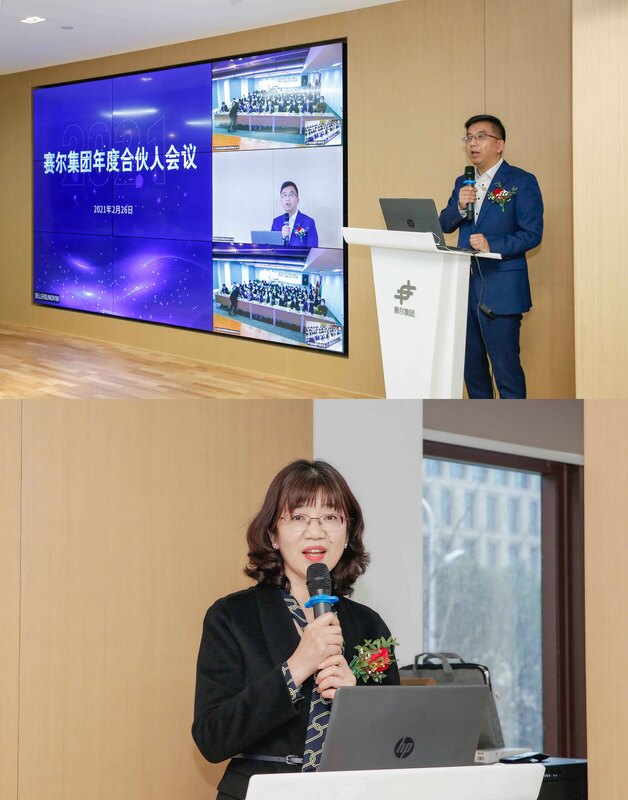 會議為新合伙人舉行了隆重的簽約儀式。2020年,我集團涌現了一批業績突出貢獻卓越的優秀干部,經綜合考評并報集團高級合伙人會議審議通過,黃輝、徐東曉、陳龍余、方芳、鄔佳毅、何波、翁麗莎、陳萍、章潔、郭云珍、李輝、胡波、林葉、張磊、董婧媛、陸建峰、趙孝磊等17位同事正式加入合伙人計劃,全集團合伙人總數增至112人。集團領導徐平炬、陳勇珍、錢天鋒分別與新合伙人簽約并合影留念。新合伙人代表集團行政總監方芳和威司那公司業務副總監翁麗莎均表示,進入集團工作一年多即有幸成為賽爾合伙人,深感當時選擇的正確,衷心感謝集團各位領導和團隊伙伴的支持與信任,未來將更加珍惜賽爾這個事業平臺,持續自我驅動并快速成長,成為集團新發展階段的堅實力量。