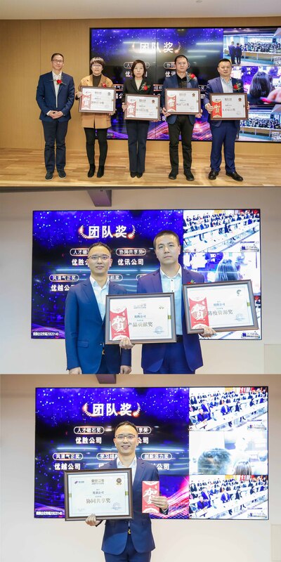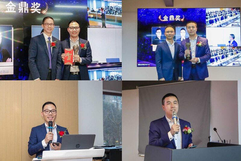 會議隆重舉行2020年度先進集體和金鼎獎先進個人表彰儀式。為有效推進企業核心價值觀落地,我集團設置了協同共享、創新活力、人才磁石、學習組織和風清氣正等5個集體獎項,2020年分別由優訊公司、綠時公司、優勝公司、優景公司和優越公司獲得,優騰公司一舉拿下“產品貢獻獎”和“防疫物資獎”兩個2020年特別設置獎項。優遠公司總經理邵紀銀和優騰公司總經理徐生科,憑借出色業績成為2020年度金鼎獎獲得者。金鼎獎歷來表彰當年有卓越業績表現的公司領導者,兩位總經理在2020年帶領團隊攻堅克難取得優異業績,對集團貢獻舉足輕重,正是金鼎獎項精神寓意的真實寫照。