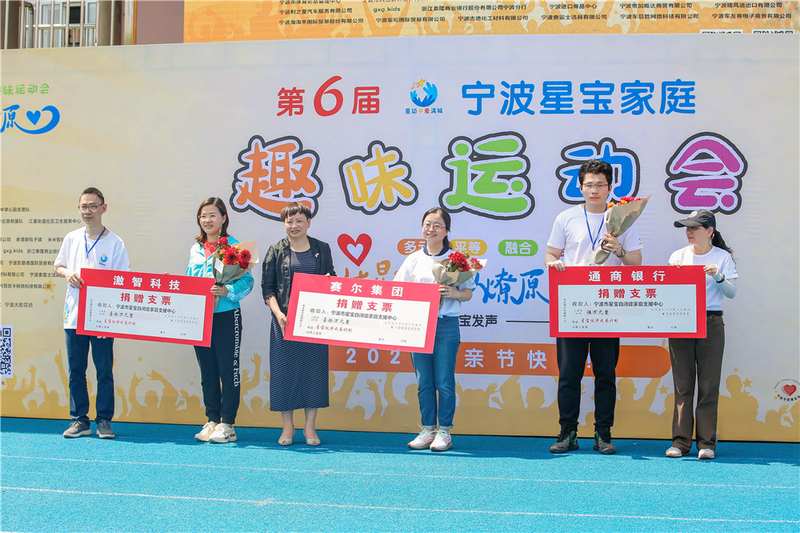 運動會上,賽爾集團向?qū)幉ㄊ行菍氉蚤]癥家庭支援中心捐贈善款40萬元,用于支持星寶自閉癥家庭支援中心開展各項幫助星寶家庭自主生活、融入社會的活動。寧波市慈善總會副會長陳海英女士、寧波市星寶自閉癥家庭支援中心主任馮東等向支持星寶家庭的愛心單位頒發(fā)了感謝證書。