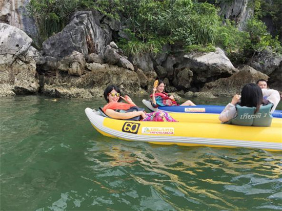 行程上的第二天,卻是真正游玩開始的第一天。一早出發前往素有海上小桂林之稱的:攀牙灣,出發時天氣晴朗,氣溫雖高,但伴著迎面吹來的海風,絲毫沒有感覺到悶熱,第一天就乘香蕉船出海,難以抑制心中的小激動,看的出來大家都滿懷期待,而沿途的美景也確實沒讓我們失望。