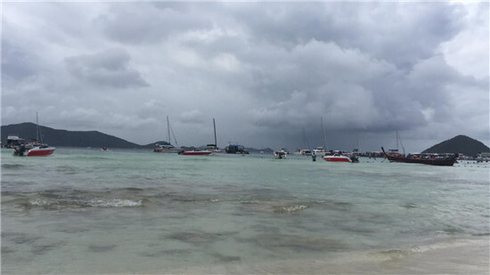 海島的天氣變幻莫測,已早有耳聞,可當真正經歷過才覺得有些不可思議,早上艷陽高照,可中午就傾盆大雨,更不可思議的是在目力所及的同一片天空下,竟然這半邊天是烏云籠罩,狂風驟雨,而遠處只是多云卻也晴好!突然而至的暴雨,加上較快的船行速度讓我們在瞬間濕身,狹小的船艙頂部雖有窄長的遮陽的頂棚,可絲毫不擋雨,大家又濕又冷!