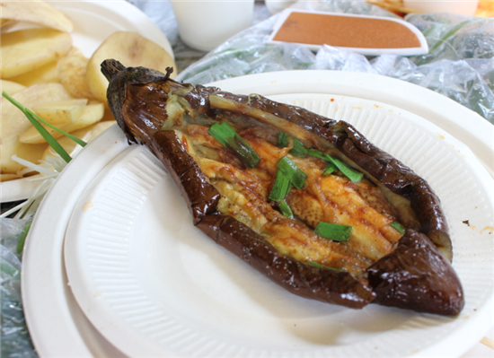 采購張總獨家秘制的烤茄子,這賣相可以登得大雅之堂了吧?可惜美食曇花一現(xiàn),瞬間就被幾雙筷子干掉了。
