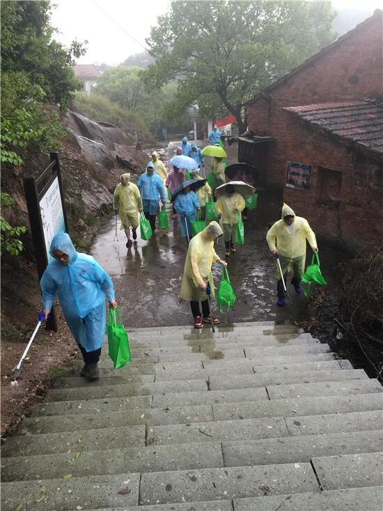 周六早上一場春雨來襲,但我們并沒有因此取消活動,而是對此次活動更加期待。大家每人領取了已經備好的雨衣,做好了在雨中邊“漫步”邊清掃旅游垃圾的準備。