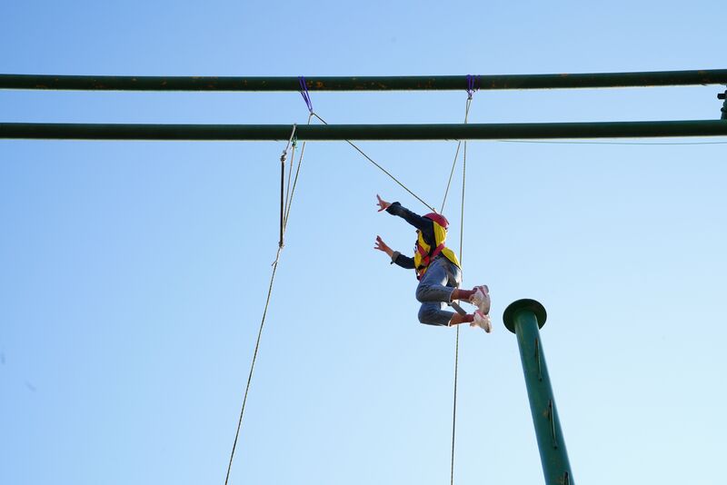 早晨,一聲激昂的哨聲響起,賽爾新人在總教練的指揮下迅速分成6個戰隊。一二!一二!一句句振人心弦的齊聲吶喊;咚咚!咚咚!一聲聲響徹土樓的球體撞擊,我們第一個項目——“鼓動人心”開始了。我們在一次次失敗中總結自身調整策略,在一次次彎腰撿球中站直身體擺正位置。隨后開始的驚險倒計時則考驗了我們的流程管理能力和快速協調能力。第三個項目是高空抓桿,大家一開始雖然都有些害怕,但最后所有成員都爬上了高柱,無人退縮,這對于一個大團隊來說,是一個多么值得欽佩的成果! 接下去的極速60秒要求每個隊伍必須在60秒內破解一個繩圈內的30張神秘卡牌,且繩圈內只能有一人來觸摸卡牌及繩子,團隊成員只能在圈外幫助圈內成員。直到比賽結束時,教練告訴我們原來規則是可以打破的,圈內成員可以把繩子扯掉,這讓我們意識到突破界限和不墨守成規有多么的重要。第一天的最后一個項目是用拼接墊來搭建高塔。大家瘋狂地堆高度,但是忘記了建筑材質和場地風力,這個項目讓我們明白了有時候地基和結構才是成功的關鍵,一味追求高度和速度只會潰敗涂地。