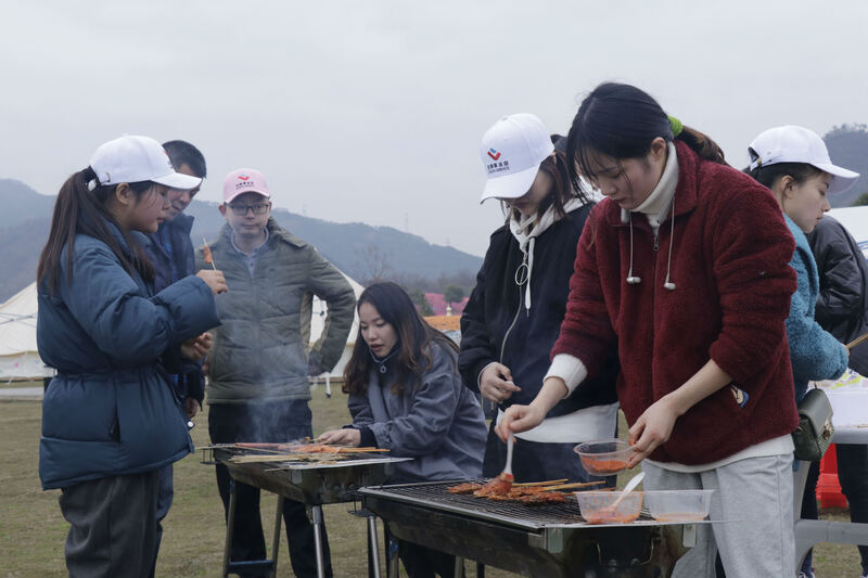 在山頂稍作休息后,我們轉(zhuǎn)戰(zhàn)了下一站目的地——花間樂園。五彩繽紛的風車被有序的排滿在山坡上,風一吹風車也就隨風擺動,頗有創(chuàng)意。我們租了帳篷和燒烤架,開始忙乎起來了。有的忙著燒烤,有的忙著包餃子,而一些人早已組局開始在帳篷里玩起游戲,或是圍坐著一起閑聊,舉杯暢飲。吃飽喝足以后,天氣也開始漸漸暗下來了,此次活動隨著黑夜的降臨落下帷幕。
