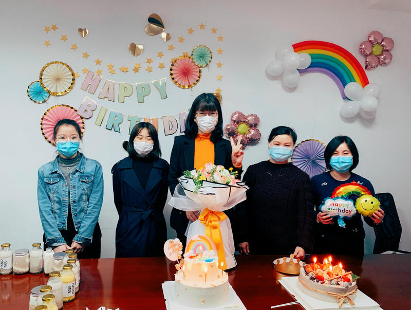 陽春三月匆匆而過,眨眼四月也已到中旬。4月15日,在這個喜氣洋洋發工資的好日子里,財務管理部迎來了第一個小活動——給本月的壽星彩姐、王彬彬、謝冰清、彭金秀、陳菲籌備集體生日宴。偷偷裝扮好小會議室,準備好可口的糕點和飲料,大家一窩蜂地把壽星們擁入會議室,點好蠟燭,關上燈,一起異為他們唱生日快樂歌,許愿合影留念,氛圍非常歡樂。雖然大家都戴著口罩,但是眉眼處顯露的笑容卻是藏也藏不住。