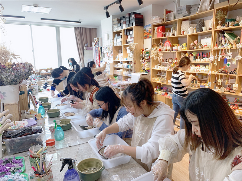 美餐過后,大家沿藥行街向東步行數百米,一路談笑風生,沒一會就來到靈橋廣場的一家DIY工坊,開啟我們的DIY手作行程。工坊雖小,但樣樣俱全。我們想體驗開蚌的驚喜,所以選擇做珍珠。每開一個珍珠蚌就像開一個盲盒,打開之前誰也不知道自己的蚌里珍珠的品相和數量。在小姐姐的指導下,大家陸續打開珍珠蚌,把里面大小不一的珠子取出,經過清洗和拋光,篩選出合適的珠子,統一進行打孔。不多久,手鏈、項鏈、耳釘等珍珠飾品就新鮮出爐了。