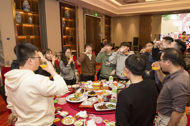 夜幕降臨,寧波綠時同事集聚狀元樓,通過視頻方式與義烏同事們共同享受一場視聽盛宴。晚會以謝總簡短卻有力的致辭拉開序幕,歌曲、舞蹈等精彩節(jié)目應(yīng)有盡有。此外,8輪抽獎環(huán)節(jié),從家用電器到現(xiàn)金大紅包,獎品拿到手軟,現(xiàn)場氛圍激動熱烈。游戲環(huán)節(jié)稱為一絕,以“桌”為單位進行游戲,最快速度完成團隊目標(biāo)的獲勝,并且有大紅包獎勵,豐富的游戲引得全場哄堂大笑。晚會最后,由領(lǐng)導(dǎo)們領(lǐng)唱,全體綠時同事合唱《明天會更好》,表達(dá)對綠時未來的美好期望。