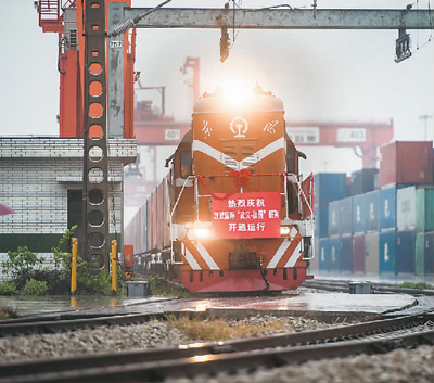 2016年4月6日,滿載機械、電子等產品的“漢新歐”班列從武漢吳家山鐵路中心站駛出。