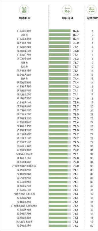 在這份榜單中,深圳、上海、東莞分別占據綜合排名的前三,其他入圍百強的浙江城市還有杭州(第21位)、金華(第22位)、嘉興(第27位)、舟山(第28位)、臺州(第67位)、紹興(第70位)、湖州(第85位)、溫州(第86位)。