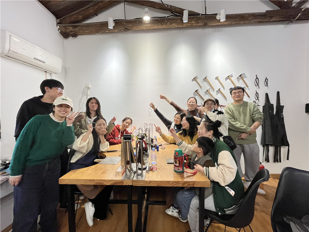 單證部選擇了一家手工銀造坊,今天的任務是每人打造一只屬于自己的手鐲。作坊里展出著精致的手工制品,琳瑯滿目。大家選好了自己心儀的款式后拿到了制作手鐲的原材料。經過老師詳細的教學,大家紛紛投入制作。一遍遍地敲打,刻上屬于自己的logo,打磨出自己喜歡的紋路,經過兩個小時的制作,一只只漂亮的手鐲終于陸續完成了。