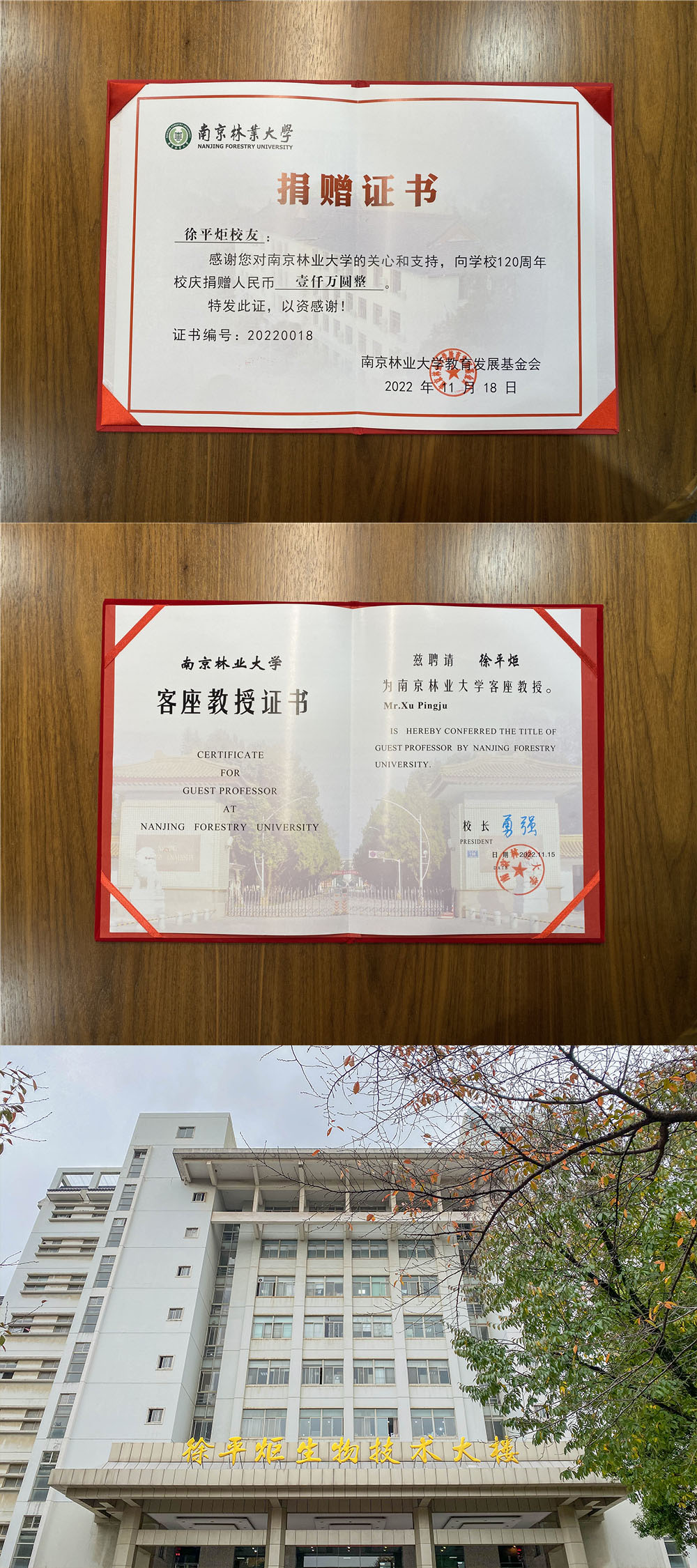 誠樸雄偉兩甲子,樹木樹人雙一流。2022年10月,南京林業大學迎來120周年華誕,徐平炬董事長11月17日前往南京,參加南林大120周年校慶系列活動。校慶之際徐平炬個人向母校捐贈1000萬元助力學校事業發展,捐贈儀式之前,資金已經到賬南林大教育基金會。