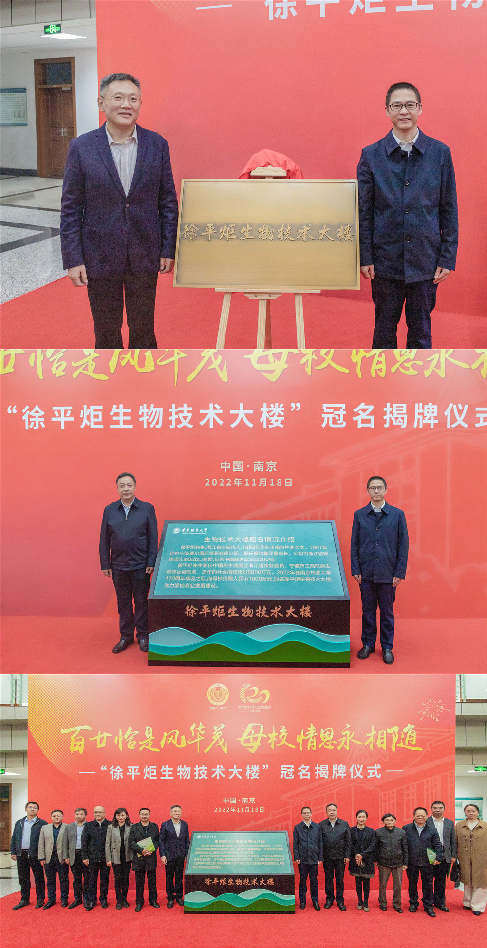 為感謝徐平炬校友對母校的深情厚意,學校決定將生物技術大樓冠名為“徐平炬生物技術大樓”,徐平炬董事長和趙茂程書記共同為“徐平炬生物技術大樓”揭牌。生物技術大樓建成于2004年,坐落于校園中部教學區,櫻花大道南端。學校林木遺傳與生物技術教育部重點實驗室、國家林草局南方林木種子檢測中心和南林大校史館均位于此。這座大樓必將成為南京林業大學高層次科技人才聚集的高地,尖端科技科研成果誕生的搖籃,意義重大且影響深遠。隨后與會領導和嘉賓參觀了南林大校史館。