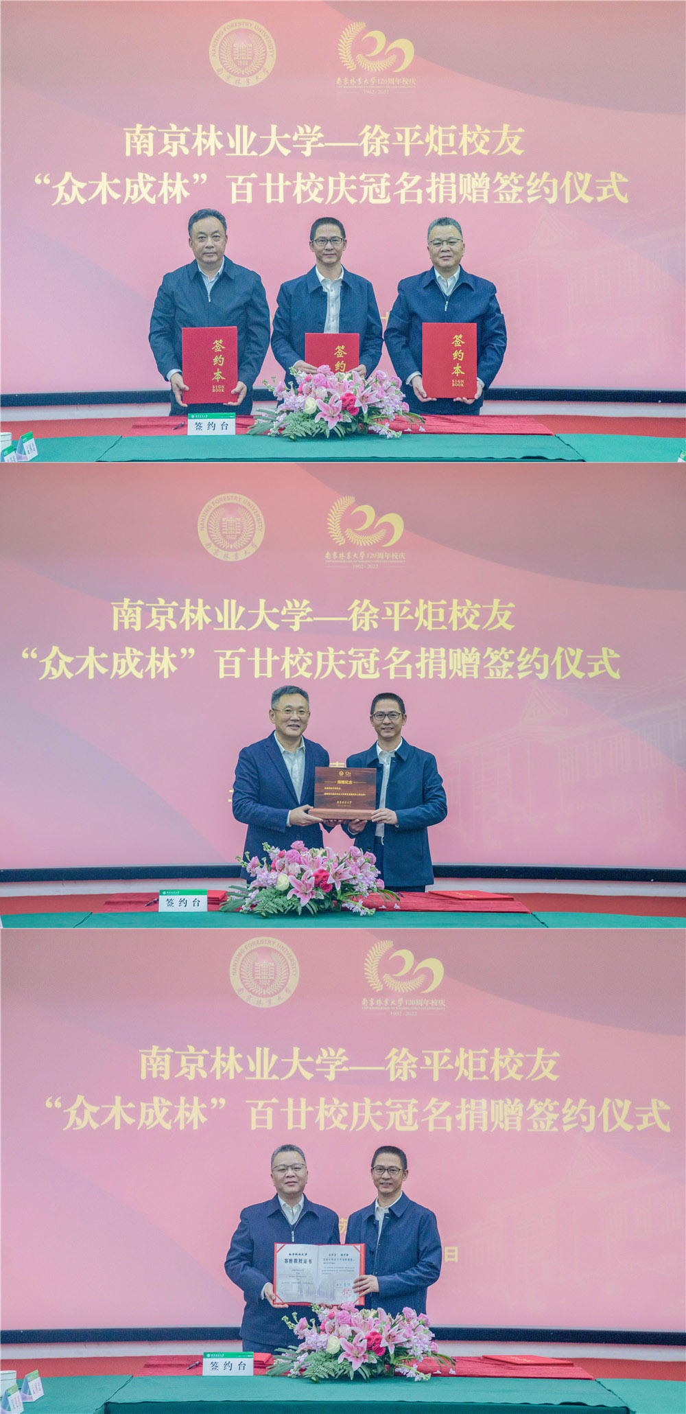 徐平炬董事長、勇強校長和劉中亮副書記分別代表捐贈方、受捐方和接受方共同簽署“眾木成林”百廿校慶冠名捐贈協議。趙茂程書記為徐平炬校友頒發捐贈證書和紀念牌。南京林業大學聘請徐平炬校友擔任經濟管理學院客座教授并頒發聘書。
