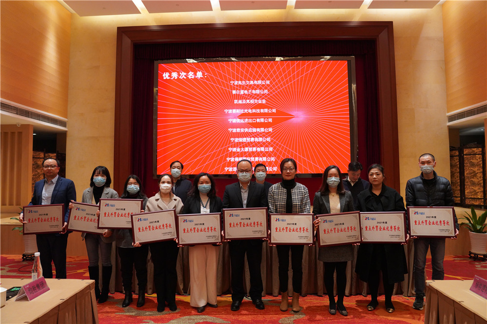會議通報了高新區2021年度外貿企業獲“進出口上等次”名單并授牌。優遠公司獲得“重點外貿企業優秀等次獎”,將獲得政策獎勵10萬元,集團行政副總經理方芳上臺接受榮譽牌匾。
