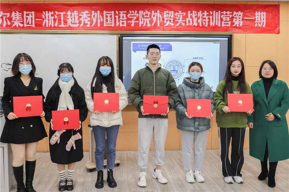 西方語(yǔ)言學(xué)院黨委副書記方江英,集團(tuán)優(yōu)騰公司總經(jīng)理徐生科,學(xué)院教師代表及特訓(xùn)營(yíng)學(xué)員共同參加了此次結(jié)營(yíng)儀式。27位同學(xué)領(lǐng)取結(jié)業(yè)證書,6位同學(xué)榮獲優(yōu)秀學(xué)員稱號(hào)。學(xué)生代表董麗虹年后即將加入集團(tuán),她在發(fā)言中分享了參加特訓(xùn)營(yíng)的收獲和感受,同時(shí)感謝集團(tuán)讓同學(xué)們有機(jī)會(huì)在校期間就能了解外貿(mào)行業(yè),為今后職業(yè)選擇提供了方向、夯實(shí)了基礎(chǔ)。