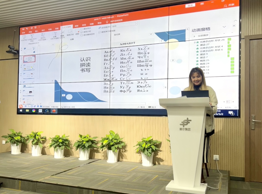 最初,大家學習33個俄語字母的音標和發音,并通過聽說讀寫來鞏固,緊接著是單詞和一些日常用語的學習。老師每節課都會帶領我們鞏固上節課的知識點,然后開始學習新的知識,也會通過視頻、音頻等方式讓我們更加方便地去領悟知識。