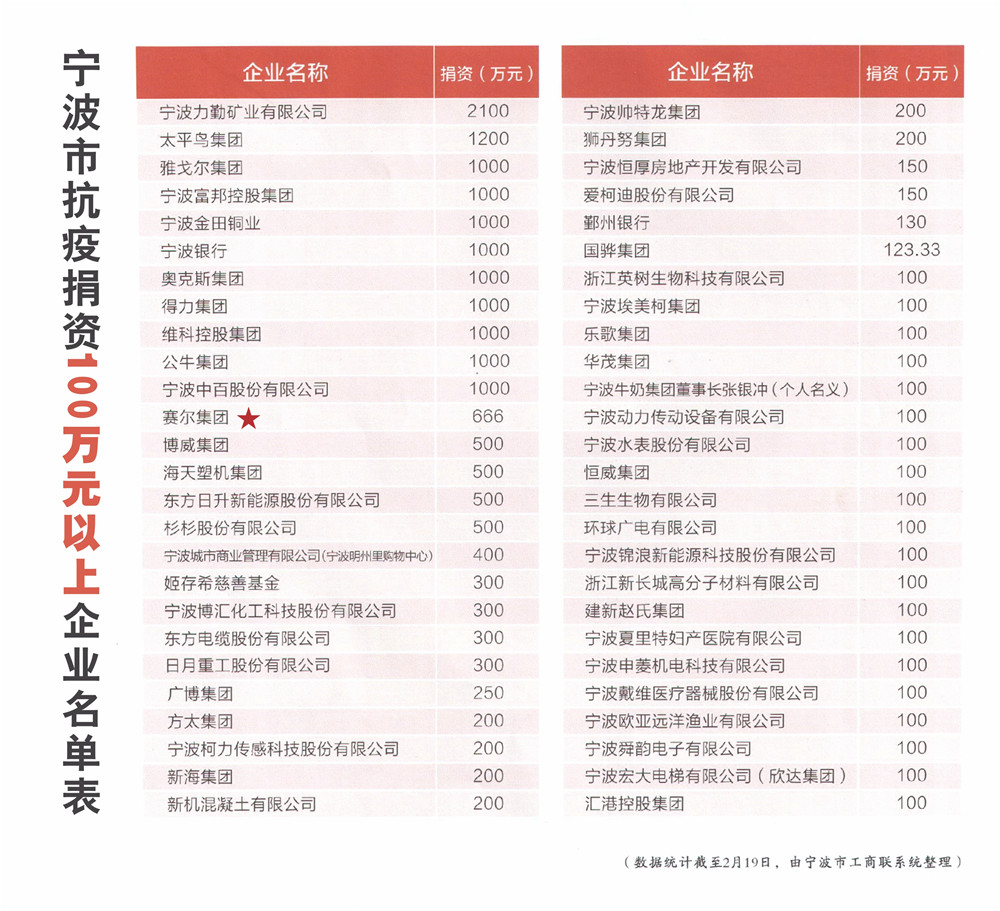 2018年1月,向中華思源工程基金會捐贈40萬元,用于彩虹人生項目。4月,向?qū)幉ù壬瓶倳栀?0萬元,支持寧波星寶自閉癥家庭支援中心。6月,向奉化慈善總會捐贈20萬元,用于奉化區(qū)西塢街道孔峙村社區(qū)活動中心建設。9月,通過寧波保稅區(qū)民營企業(yè)協(xié)會,向貴州普安縣捐贈扶貧款5萬元。10月,向奉化區(qū)西塢中學捐贈20萬元用于購買教學影像設備等。11月,通過民建寧波市委會向吉林延邊捐贈價值15萬元的愛心物品。11月,向?qū)幉|西部協(xié)作對口區(qū)域青海天峻縣捐贈價值39.8萬元的愛心物品。12月,參與寧波市工商聯(lián)組織的“百村幫百企、百企聯(lián)百戶”扶貧行動,與青海天峻縣新源鎮(zhèn)、陽康鎮(zhèn)等地的25個村子結對,捐贈幫扶資金105萬元,以及價值69萬元的愛心物品。