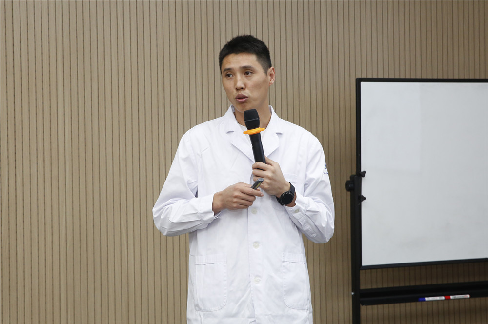 應鐵松醫(yī)生從事運動醫(yī)學康復、中醫(yī)針推理療工作近20年,經(jīng)驗十分豐富。應醫(yī)生首先針對頸椎、肩關(guān)節(jié)、腰椎、腿部分塊進行了詳細的理論知識講解,并邀請有各部位不適的同事分別上臺現(xiàn)場面診,剖析病痛形成的具體原因,并針對不同癥狀逐一進行了對癥的治療動作示范。最后,針對辦公室久坐人員常發(fā)生的頸肩不適,應鐵松醫(yī)生現(xiàn)場帶領(lǐng)大家一同做了“搖頭晃腦”頸椎操和“向后仰頭、向后展開肩膀”的放松動作,現(xiàn)場互動氛圍良好。